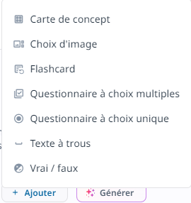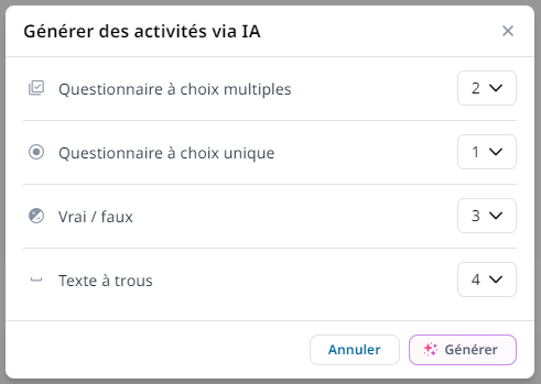 L'ajout d'activités pédagogiques a aussi été repensé pour vous permettre de sélectionner rapidement les activités que vous souhaitez générer, en précisant le nombre de questions par activité.