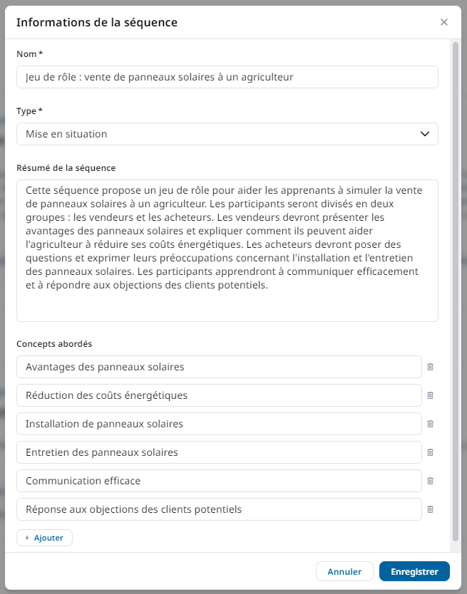 Définissez ensuite les concepts clés à aborder, manuellement ou grâce à l'IA, pour enrichir le contenu de vos séquences.