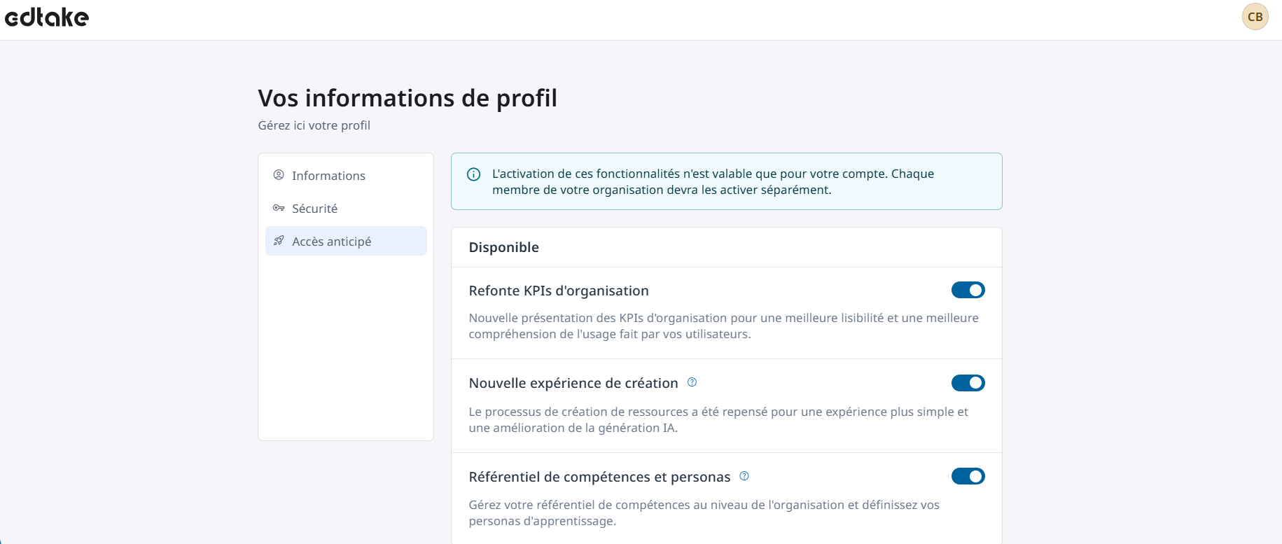 Activer l’accès anticipé, c’est l’opportunité de tester les nouvelles fonctionnalités avant leur sortie officielle et de découvrir en avant-première les évolutions d’edtake. En tant qu’utilisateur, vous pouvez ainsi donner votre avis sur leur utilité, leur clarté et leur ergonomie.