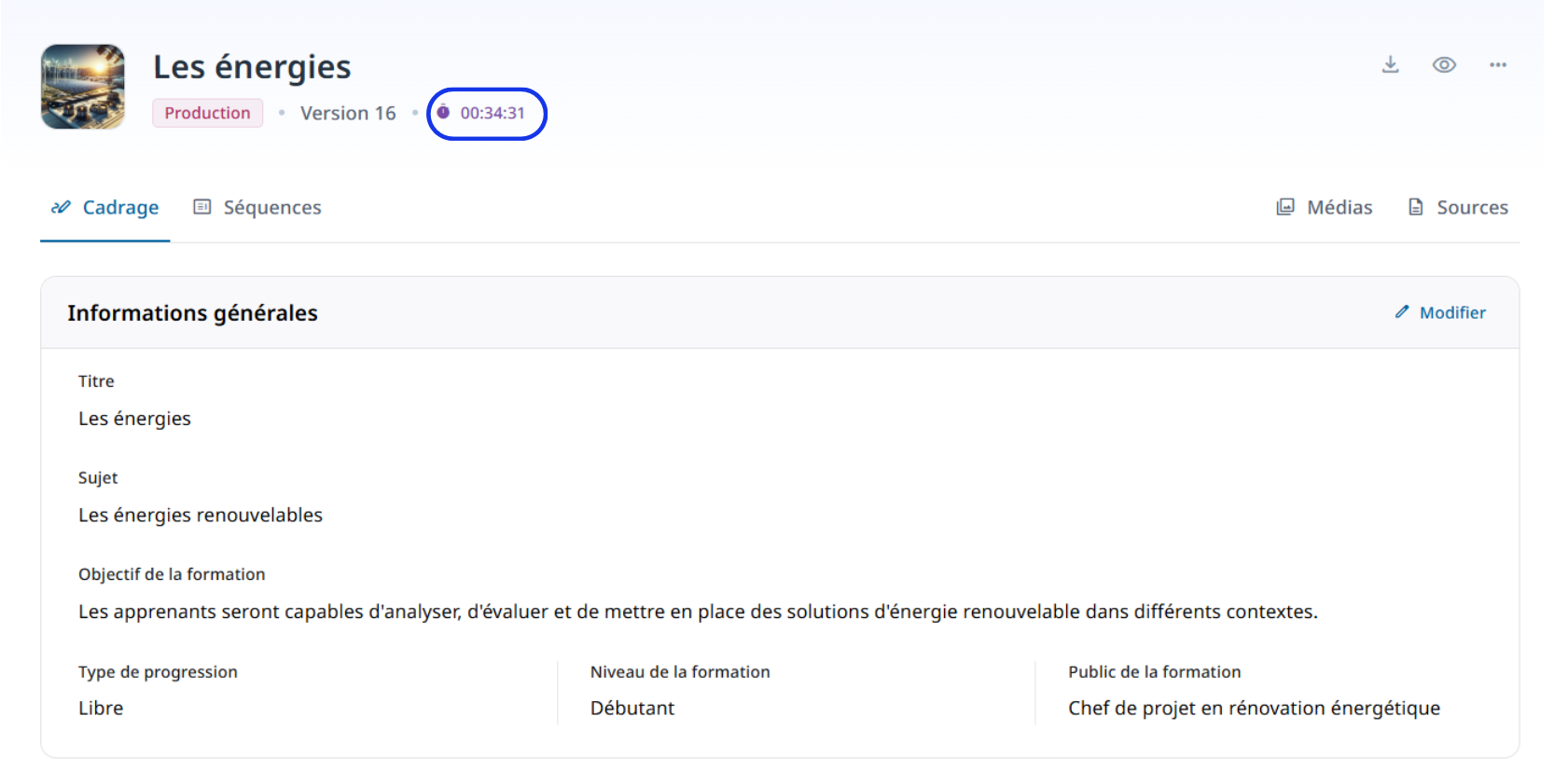 Au niveau du module : en haut à gauche, à côté de la version du module. Elle correspond à la somme des durées de toutes les séquences qu’il contient.