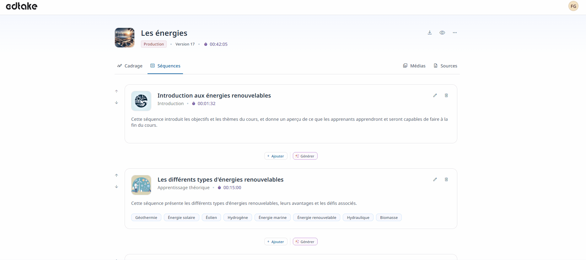 La durée estimée vous permet de visualiser rapidement le temps moyen nécessaire pour parcourir un module ou une séquence sur edtake. Elle est calculée automatiquement à partir du contenu que vous ajoutez, mais vous avez également la possibilité de l’ajuster manuellement si nécessaire.