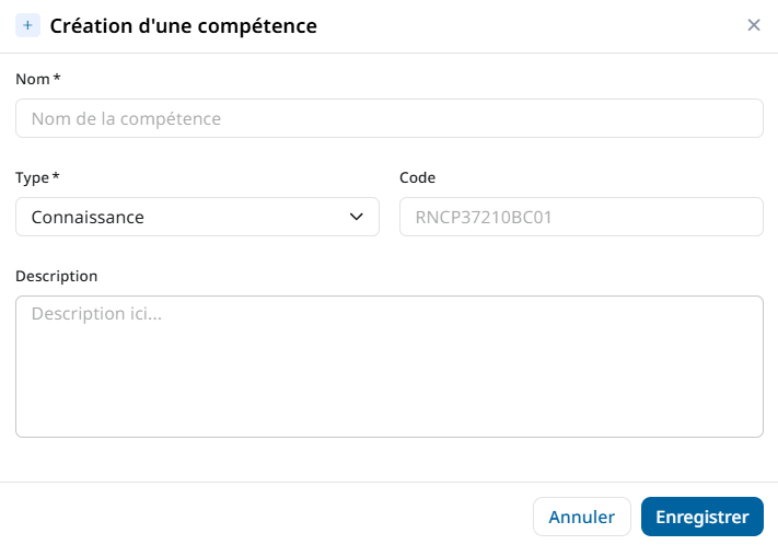 Lors de la création d’une compétence, il est vivement recommandé d’ajouter une description précise pour permettre à l’IA de générer des contenus pédagogiques alignés avec vos objectifs.
