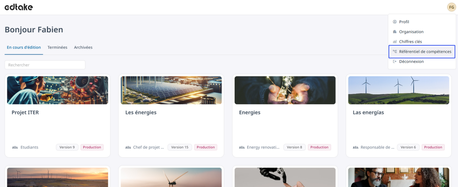Pour y accéder : cliquez sur votre avatar en haut à droite de votre espace de travail, puis rendez-vous dans l’onglet « Référentiel de compétences ».