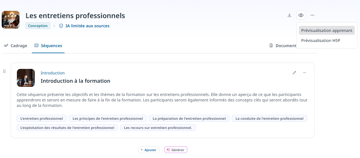 La prévisualisation apprenant est un outil essentiel qui permet aux concepteurs de formation de s'assurer que le contenu qu'ils ont créé sera présenté de manière optimale aux apprenants. Avant de rendre la formation accessible à vos apprenants, vous pouvez voir exactement ce qu'ils verront, vous permettant ainsi d’ajuster le contenu et la structure si nécessaire.