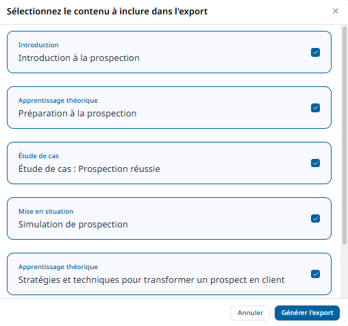 Vous avez la possibilité d'exporter votre formation au format Word (DOCX), soit dans son intégralité, soit séquence par séquence. Deux options d'export sont disponibles :