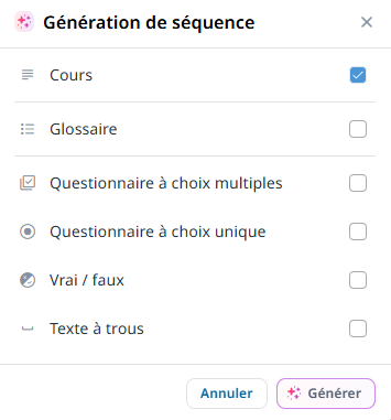 Génération automatique de contenu : En entrant dans une séquence, vous pouvez choisir de générer du contenu grâce à l’IA, avec la possibilité de sélectionner ce que vous souhaitez produire. Par exemple, vous pouvez opter pour la création du cours uniquement, ou inclure le glossaire en complément.