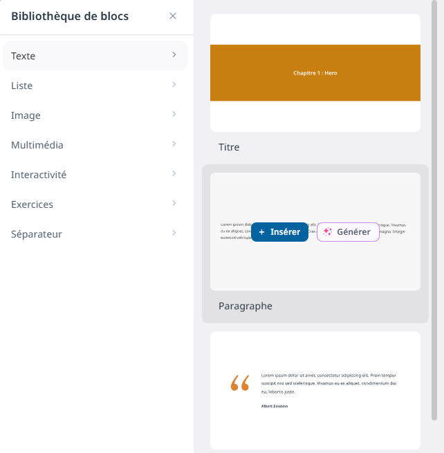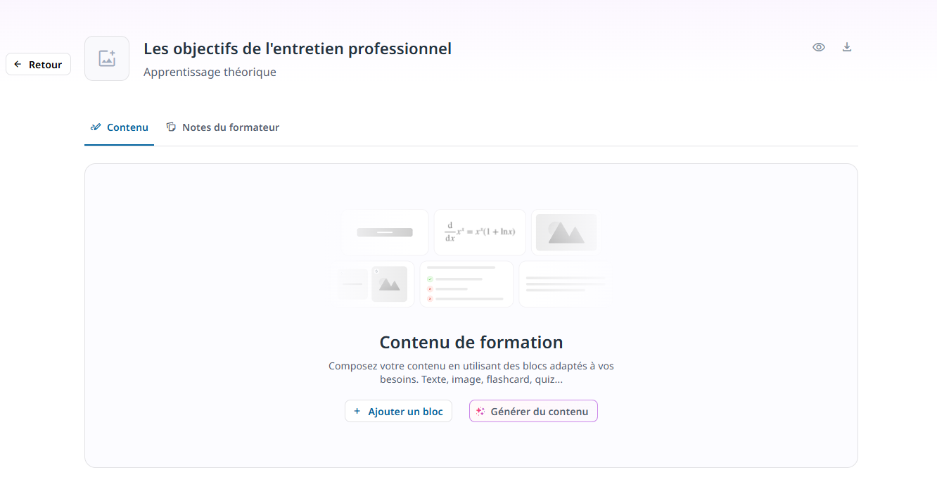 Ajout manuel de contenu : Si vous préférez un contrôle total sur la structuration de votre formation, vous pouvez ajouter votre premier bloc de contenu manuellement. Il vous suffit de cliquer sur le bouton "Ajouter un bloc", ce qui ouvrira une bibliothèque riche en blocs disponibles. Chacun de ces blocs est conçu pour répondre à différents besoins pédagogiques, vous offrant ainsi une grande flexibilité dans la conception de vos contenus. Vous y trouverez des options pour ajouter des paragraphes de texte, des quiz interactifs, des vidéos, des listes à puces, et bien plus encore. À chaque ajout, vous avez le choix de générer automatiquement votre contenu à l'aide de l'IA ou de le rédiger manuellement, selon vos préférences.