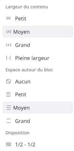 - Accéder aux paramètres de taille, d’espacement et de disposition ( pour les blocs de format 2 colonnes ) pour ajuster la mise en page.