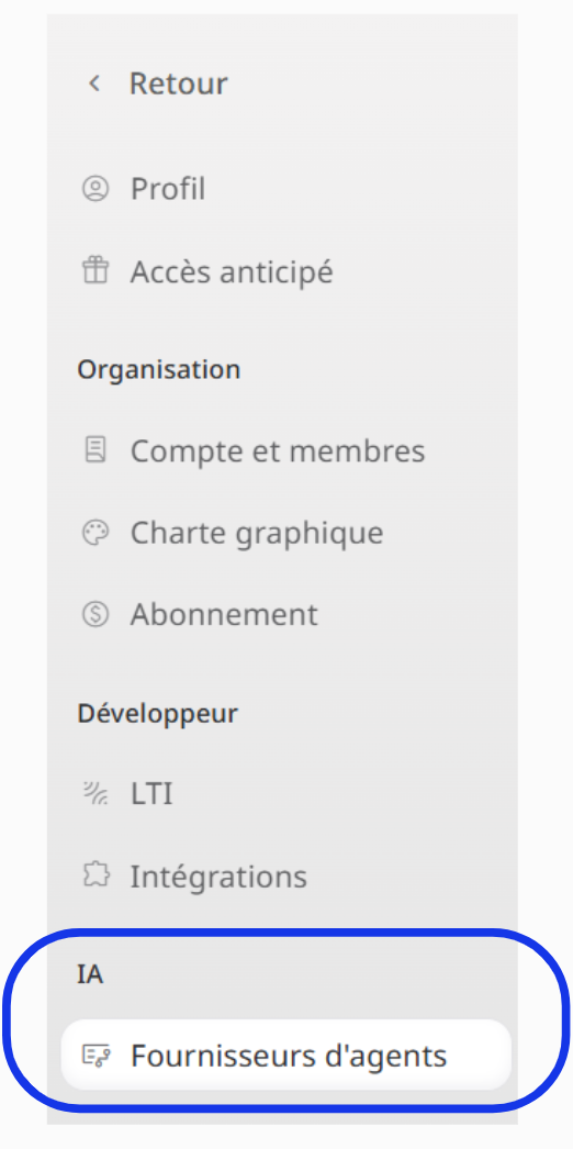 La sélection d’agents IA est instantanée et se gère par l'administrateur, au niveau de votre organisation.