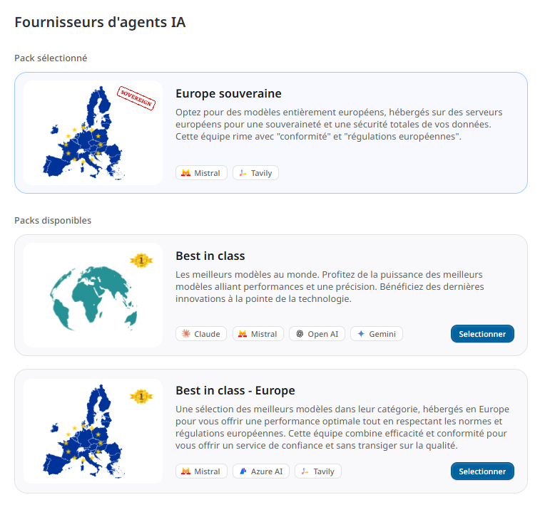 - Performance : choisissez un équilibre entre les meilleurs modèles alliés à un hébergement européen.