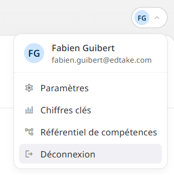 Vos modules sont toujours accessibles depuis votre tableau de bord. En haut à droite de l'écran, votre icône de profil vous donne accès aux :