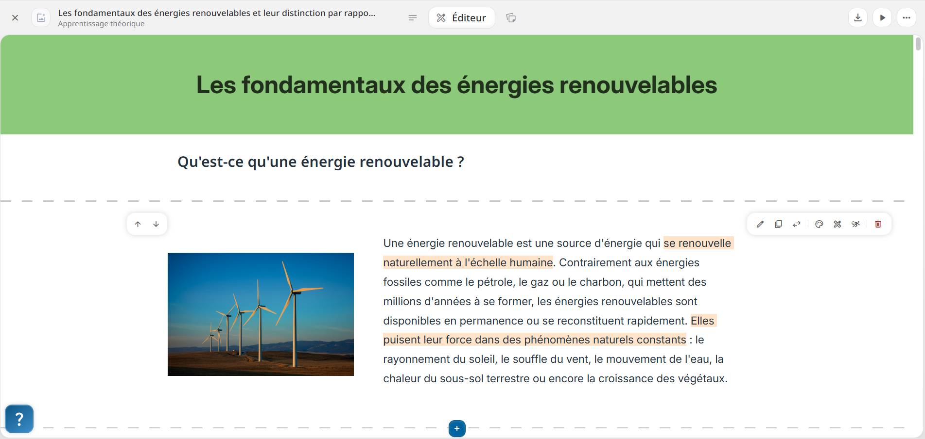 - Notes: Un espace pour les notes du formateur. Vous pouvez y renseigner toutes les informations utiles pour vous-même ou pour d'autres formateurs qui pourraient utiliser ce même contenu.