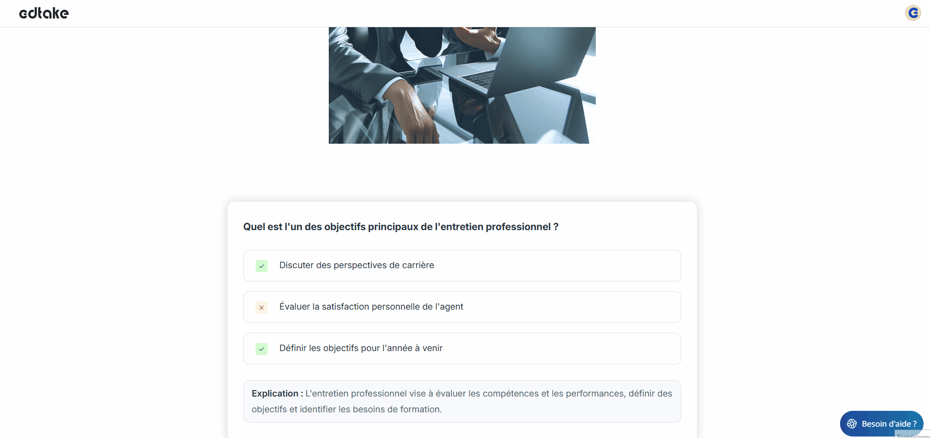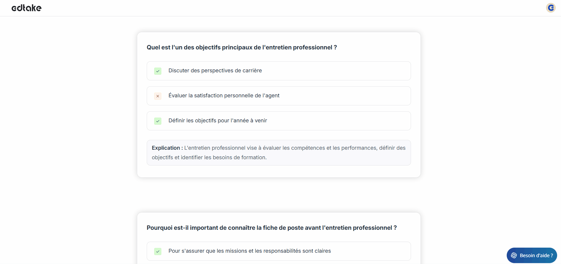 - Affichage des réponses après évaluation : Choisissez d'afficher ou non les réponses de l’apprenant après qu’il ait soumis ses réponses, pour lui permettre de consulter ses résultats en temps réel.