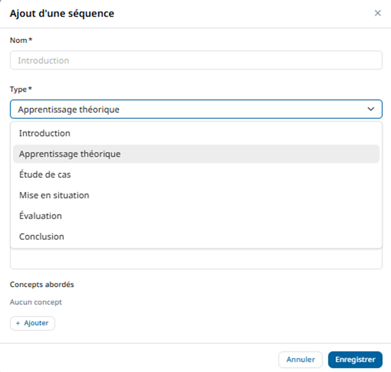 Pour en créer une, rendez-vous dans le déroulé pédagogique de votre séquence, puis cliquez sur "Ajouter". Renseignez les champs suivants: titre, résumé et typologie (étude de cas). Ensuite, indiquez les concepts clés à aborder dans le contenu qui sera généré.