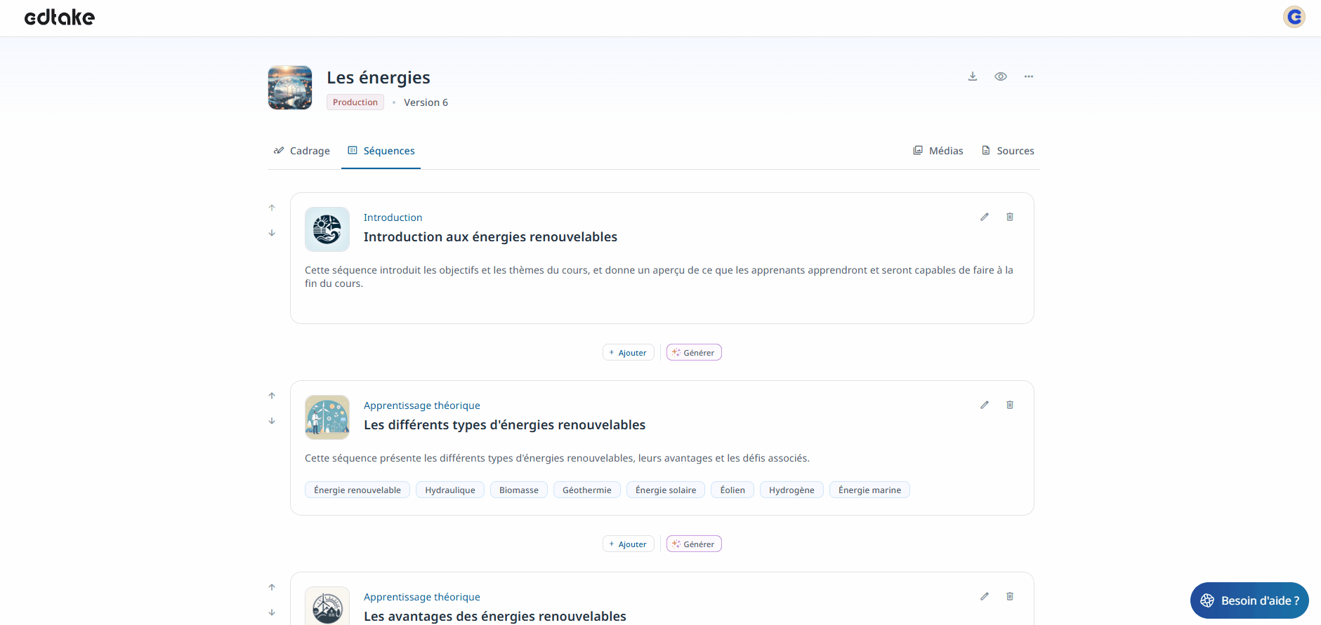 Pour générer votre contenu, l'IA d'edtake se base sur le nom, la typologie (qui va définir la structure du contenu), le résumé et les concepts à aborder de votre séquence, qu'elle ait été générée par l'IA ou créée manuellement. Ainsi, n'hésitez pas à cliquer sur le crayon pour éditer, vérifier et compléter ces éléments, afin d'obtenir un contenu de cours et d'activités cohérent avec vos objectifs.